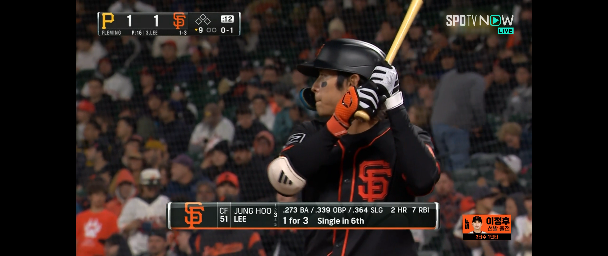 간신히 이정후의 마지막 타석만 보는 정도! 잘 쳤는데 아쉽게도 중견수에게 잡혔네.